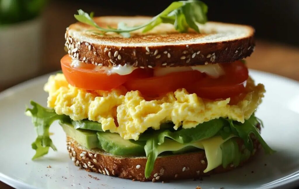 This is the perfect combination of creamy, fluffy scrambled eggs, buttery avocado, and crisp, fresh vegetables, all layered between golden, toasted slices of bread. It’s simple yet indulgent, versatile enough to serve as a quick breakfast, a satisfying lunch, or even a light dinner.