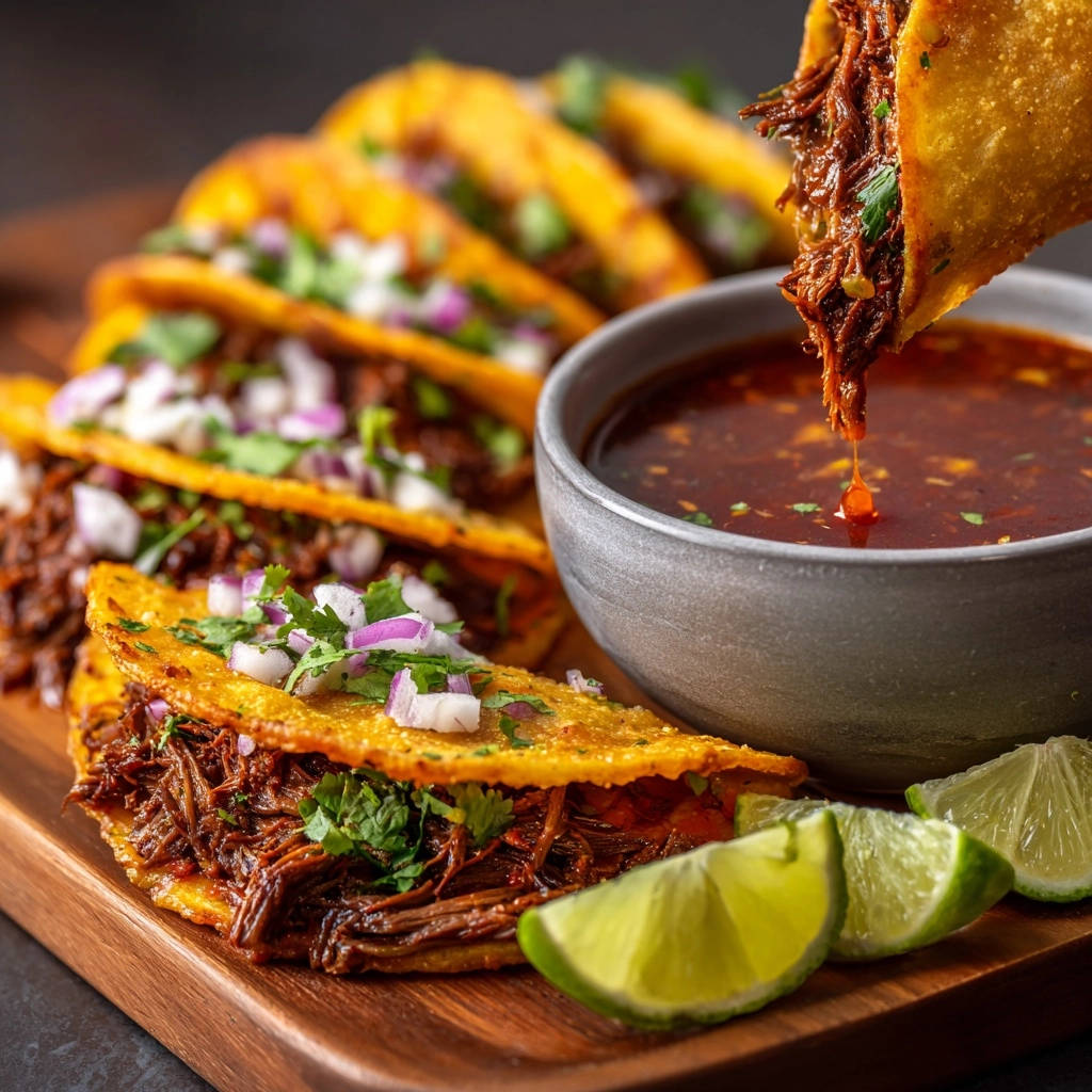 Beef Birria Tacos combine everything you love in a taco: Slow-cooked shredded meat in rich chile-spiced consommé. Corn tortillas dipped in that broth and crisped to perfection. Melty cheese (Oaxaca, mozzarella, or Monterey Jack) served with a cup of hot, savoury birria broth for dipping.