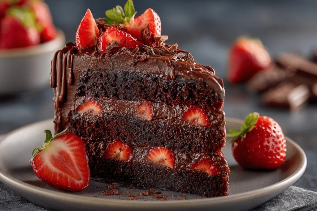 This decadent, layered treat combines the deep richness of moist chocolate cake with the natural sweetness of fresh strawberries, all tied together with a luscious whipped cream or velvety chocolate buttercream frosting.