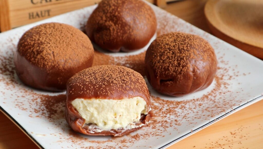 Chill for 10–15 minutes before serving to allow the mochi to set and soften slightly around the creamy core.