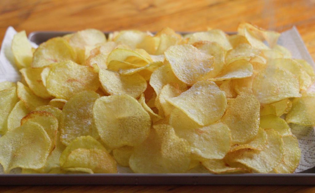 The key to crispy chips is to use enough oil to just coat every single chip on both sides, without using too much oil. Using too much oil can cause the chips to burn more easily and become greasy and soggy. The results of these potato chips will blow your mind. Take the potatoes and slice them thinly until all potatoes have been well sliced.
