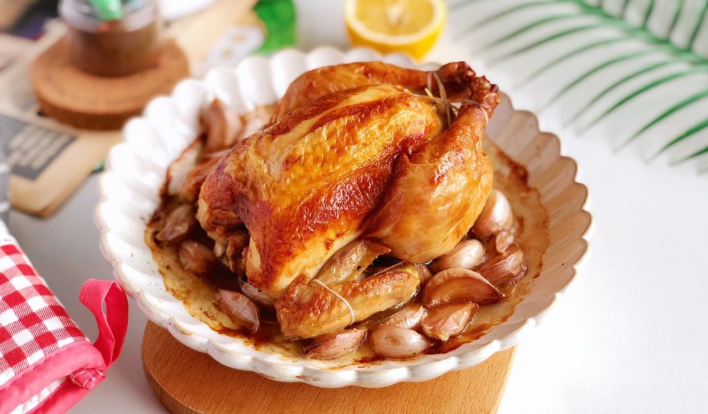 Many air fryers have a shortcut button for roasting chicken. The temperature and time are set. It is generally recommended to roast chicken at 180 degrees for 40 minutes. Bake until you are satisfied with the colour. The skin is crispy, the meat is tender, and the garlic underneath is delicious. Enjoy…
