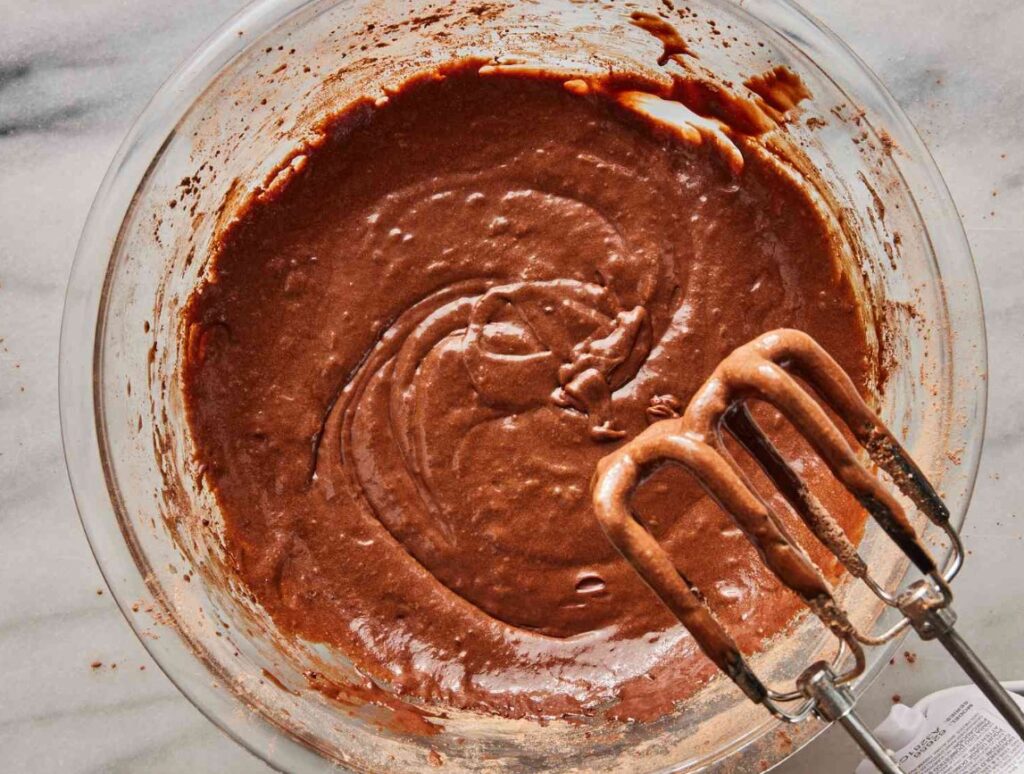Add ½ of the flour mix and stir gently, then add all the milk and stir it gently. Add remaining flour and mix just until combined, then pour in ¼ cup hot coffee (or hot water). This thins the batter and “blooms” the cocoa. Mix until smooth.