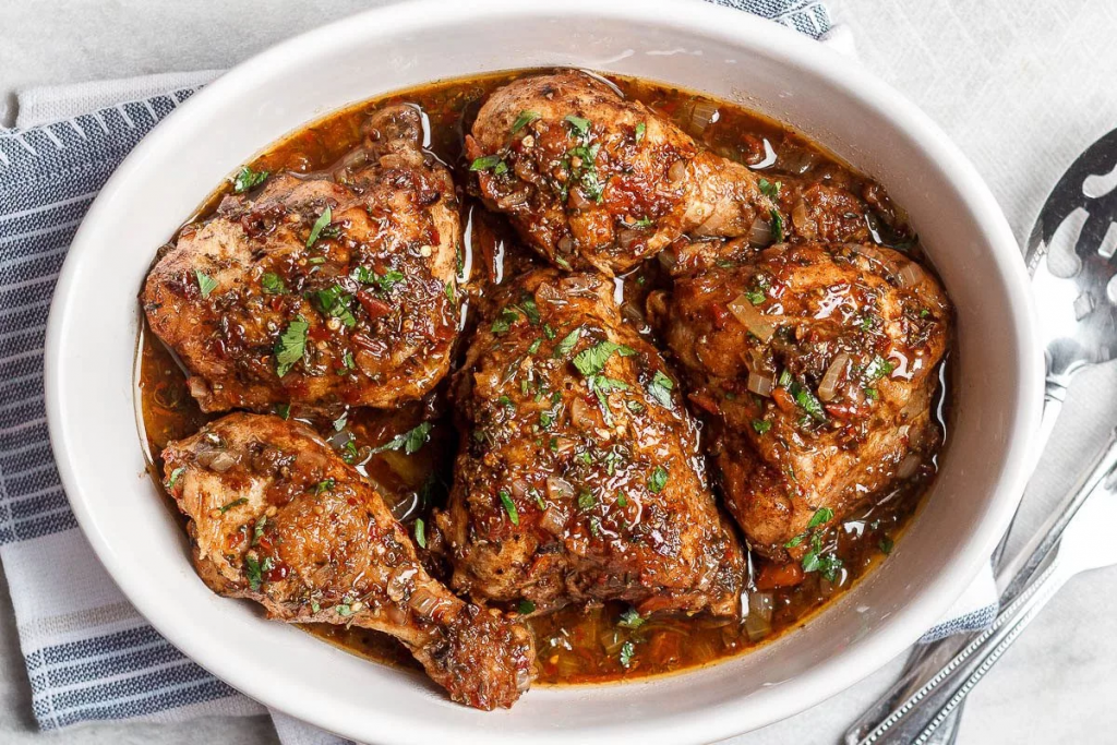 The chicken is braised in a tomato and balsamic vinegar sauce, transferring the flavours into each bite. The sauce gets reduced in the same pot to concentrate the naturally sweet, tangy and savoury flavours of the ingredients. The drippings then melt into the pan, flavouring the braising liquid. Once the chicken is seared, onions, tomatoes, and garlic are sauteed in the drippings. The onions lightly caramelize, the tomatoes cook down, and the garlic adds its aromatics.