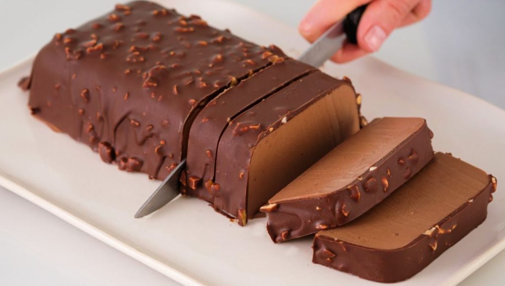Once the refrigerated chocolate has set enough, remove it from the fridge and then remove it from the mould onto a wire rack. Pour the melted chocolate over the chocolate bar and return it to the fridge for 15 minutes for the chocolate to set. Plate it, slice and serve.