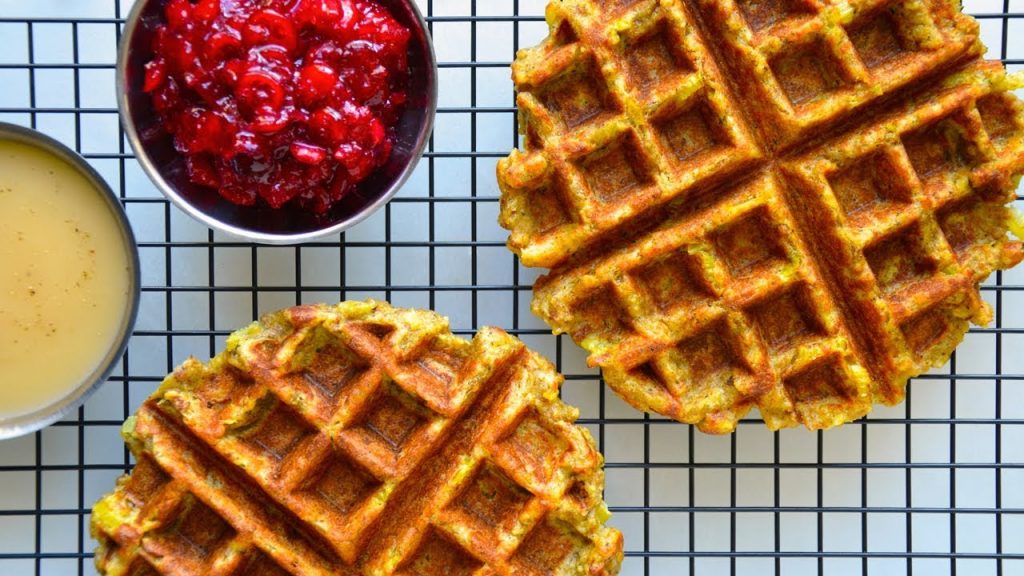 - Transfer the waffle to a serving plate then repeat the filling and baking process with the remaining stuffing. Serve the waffles with leftover cranberry sauce and warm leftover gravy.