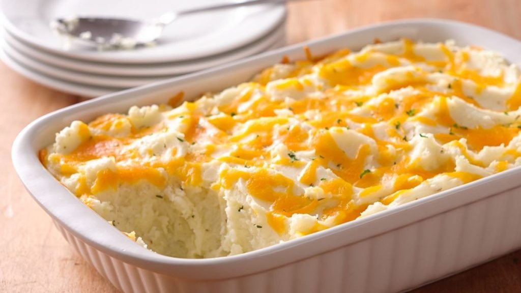 Make ahead mashed potatoes are my favorite for a big holiday dinner. This loaded mashed potato casserole jazzes up plain potatoes by adding everyone’s favorite baked potato toppings to the mix. The first step is to cook your potatoes. Boil the potatoes until they’re tender, then mash them up with plenty of butter, cheese, sour cream, and seasonings. Afterward, the mashed potatoes get spread into a casserole dish and then are topped with bacon and cheese and baked to perfection.