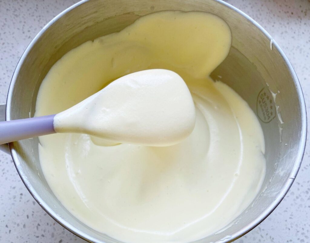 Beat this trio together on medium-high speed for 3–4 minutes, until it’s light, fluffy, and pale yellow. This is the base of your cake — the fat that carries all the flavour. You’ll notice the texture turning cloud-like — that’s your cue to move to the next step.
