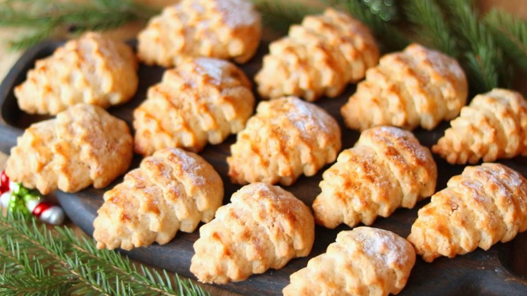 Cover the dough with a plastic wrap and place it in the fridge for 30 minutes to an hour. After chilling, remove the dough from the fridge, lightly dust your work surface then knead the dough into a layer measuring 30cm by 40 cm. Using a shaped knife for cutting vegetables, cut the dough into stripes, approximately 1.5cm wide. Roll each strip into a pine cone shape, making it tight enough.
