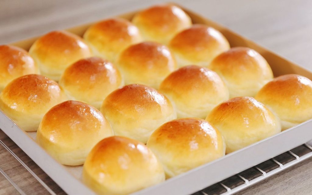 Wrap the butter into the dough and knead the butter into the dough, do this by pulling the dough then folding it and pulling it again until the dough is smooth. Round the dough and place it in an oiled bowl, cover and let it proof for 60 minutes. After an hour, take the dough onto a working surface and deflate it then cut it into 12 to 16 pieces depending on how big or small you want your buns to be. Deflate the small dough and knead it then round it into a ball.