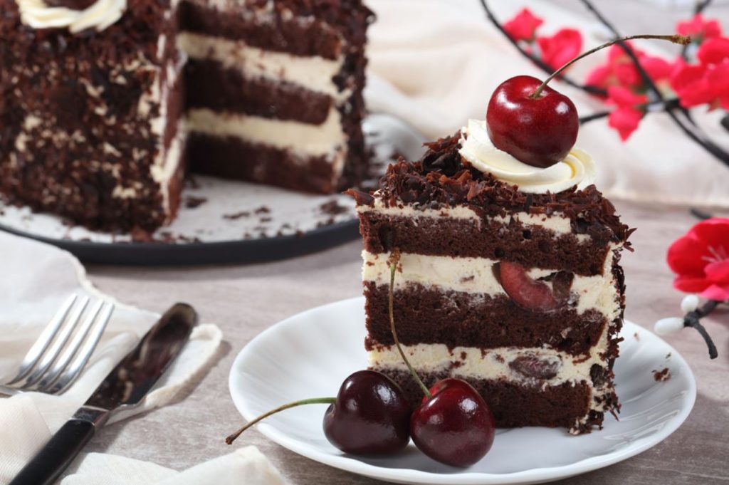 The traditional way of preparing a Black Forest Cake is to stack up two or three sponge cakes with layers of whipped cream and sweet black cherries or sour cherries. This cake is meant to have rich flavours and an alcohol punch, but it shouldn’t be too sweet.