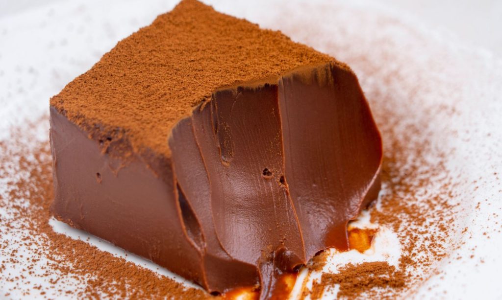 On the next day, take a tray or serving plate place it on top and turn it upside down. Remove the parchment paper, dust it with cocoa powder and immediately cut it. If you love chocolate, you have to try this.