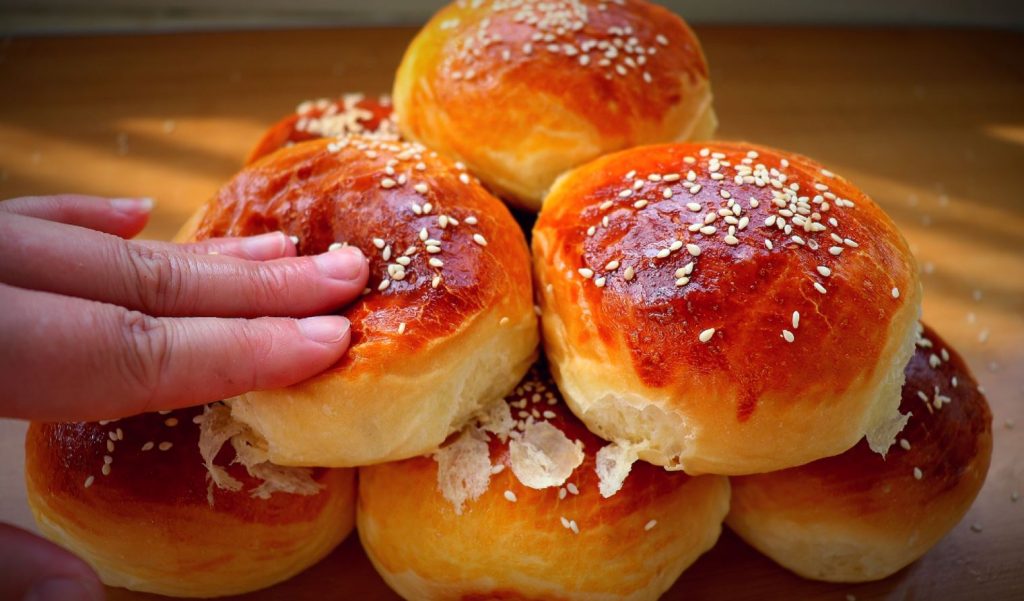 Place in a lightly greased bowl, cover with plastic wrap and let rise for 1 hour or until doubled in size. Preheat oven to 375F. Line a baking sheet with parchment paper. Turn risen dough out of the bowl and onto a lightly floured surface. Gently deflate, pressing into a rectangle. Divide dough into 10 even pieces with a board scraper or a pizza cutter. Shape each piece into a round roll.